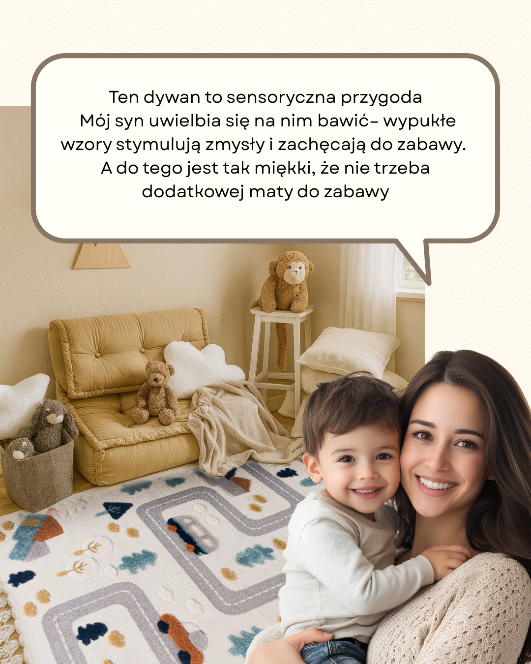 Na dywanie zaczyna się wiele historii – od pierwszych kroków, przez budowanie zamków z klocków, po odkrywanie nowych, bajkowych krain. To bezpieczna, miękka przestrzeń, w której dziecko może rozwijać wyobraźnię, uczyć się i bawić każdego dnia.
