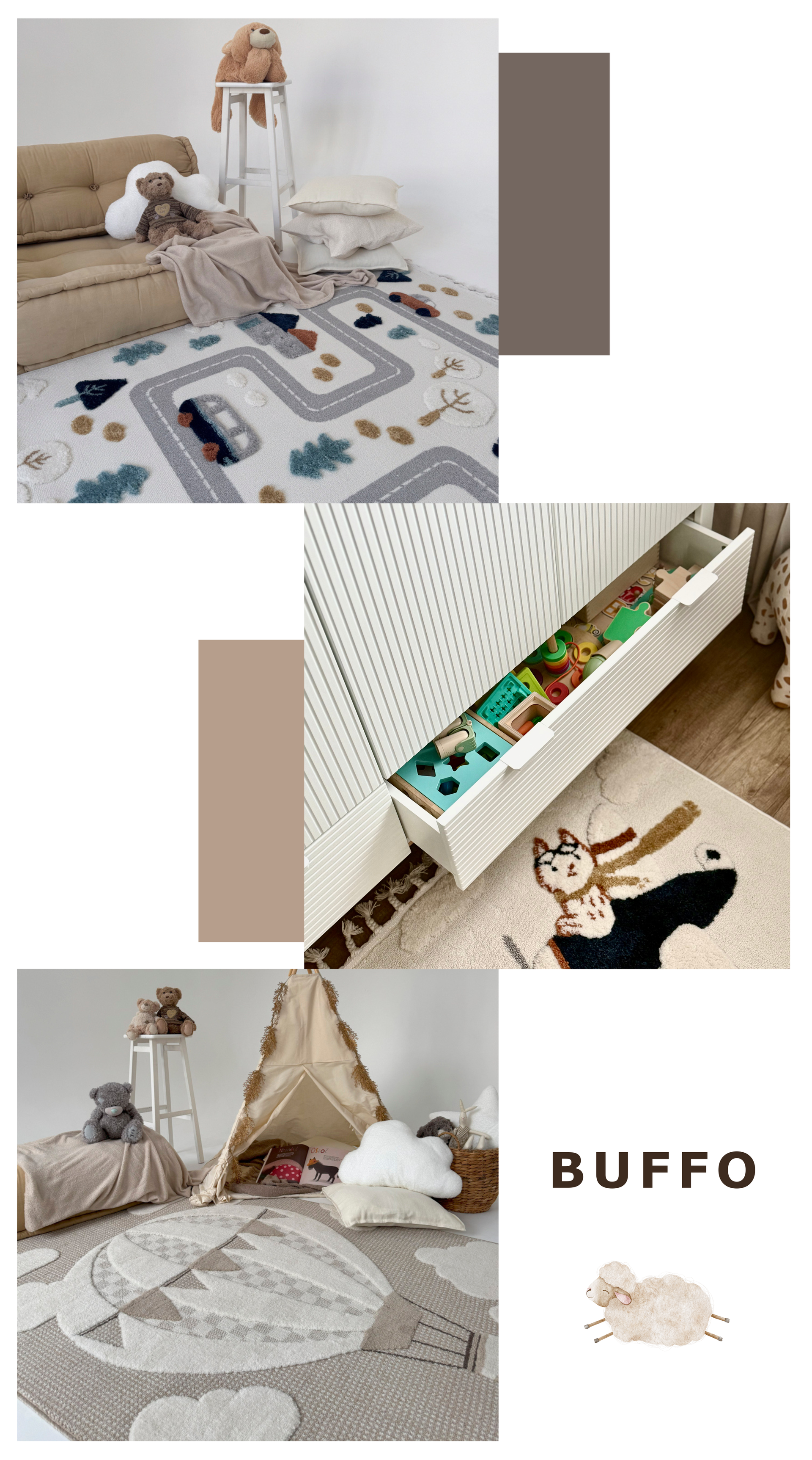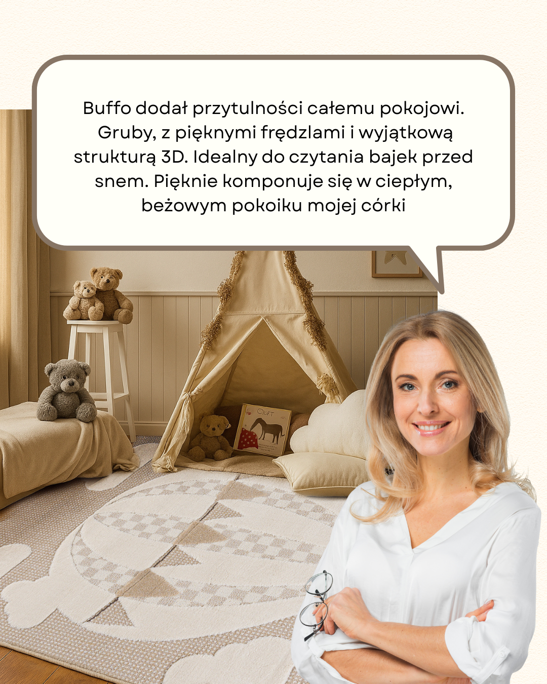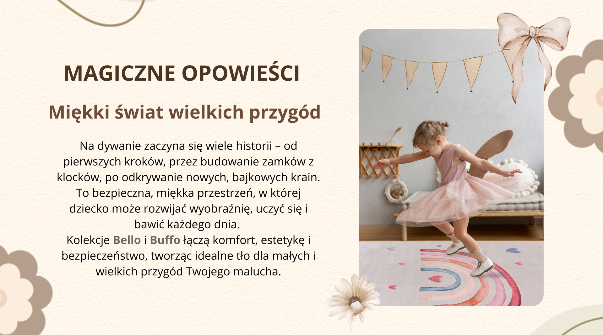 W dziecięcym pokoju dywan to nie tylko element wystroju – to scena codziennych opowieści, pierwszych kroków, wzruszeń i rodzinnych zabaw. To tutaj powstają zamki z klocków, odbywają się wyprawy w nieznane i chwile pełne śmiechu. BELLO i BUFFO tworzą bezpieczne, miękkie tło dla wszystkich małych i wielkich przygód, które składają się na codzienność Twojego dziecka. Niech pokój Twojego dziecka opowiada własną historię – od pierwszych lat, aż po kolejne rozdziały jego przygód.